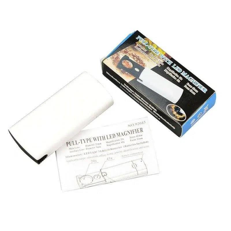 ذره بین کشویی چراغدار دارای 2 لنز 20X و 45X بوده و مناسب برای استفاده در الکترونیک ، مشاهده دقیق قطعات ریز مانند آی سی ها و… میباشد.