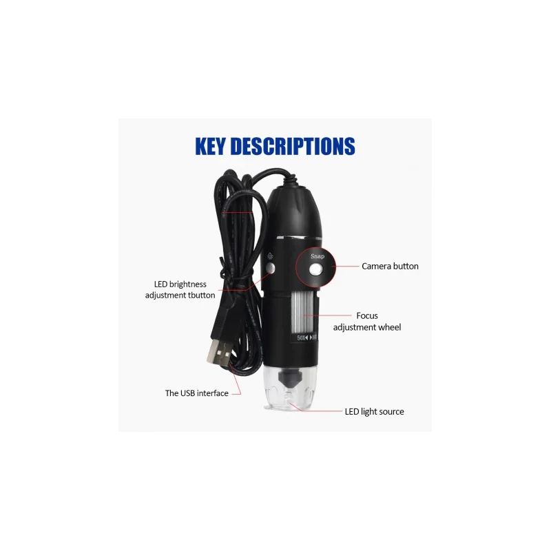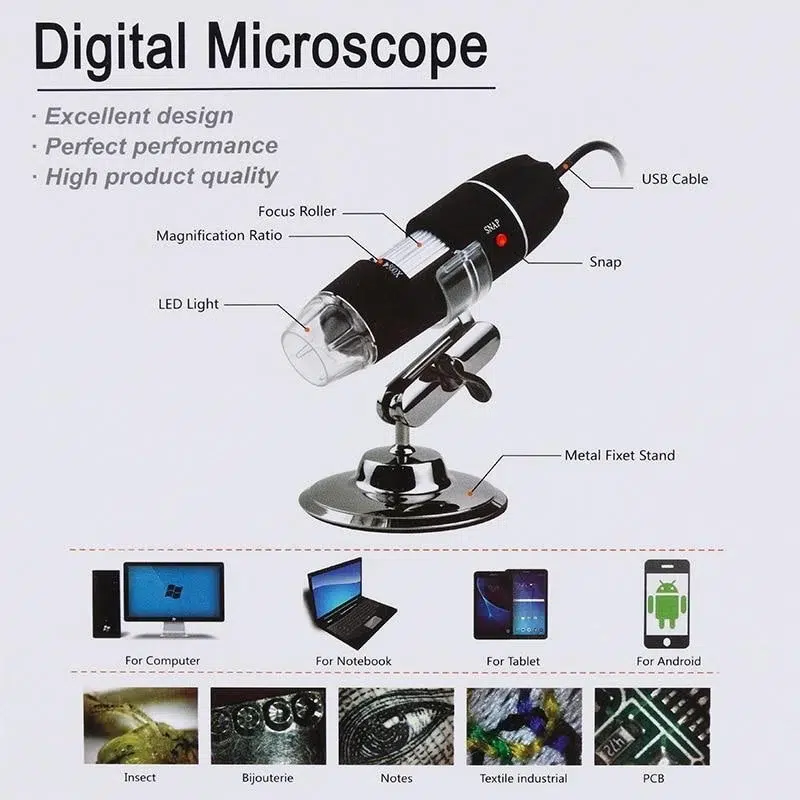 یک میکروسکوپ دیجیتال قوی با بزرگنمایی 500 برابر، قابل استفاده برای لحیم کاری قطعات ظریف و تعمیرات ریزترین و حساسترین بردهای الکترونیک میباشد. توسط این دستگاه بدون نیاز به هیچ وسیله دیگر تنها با اتصال به پورت USB یک میکروسکوپ کامل در اختیار دارید، منبع نوری قوی جهت دید کامل نمونه با ۸ لامپ LED با نور قابل تنظیم تامین می شود. قابلیت فیلم برداری از نمونه های متحرک و تشریح و … و تهیه عکس و یا حتی نمایش زنده تصاویر و فیلم جهت کارهای آزمایشگاهی و آموزشی ، این وسیله اقتصادی جایگزین ارزان قیمت یک میکروسکوپ و دوربین میکروسکوپ است و کاربرد بسیار زیادی برای بخش کنترل کیفیت کارخانجات و همچنین تعمیرکارها و مونتاژکارهای قطعات ریز دارد. |