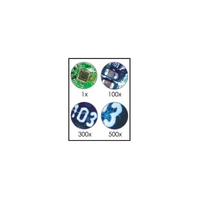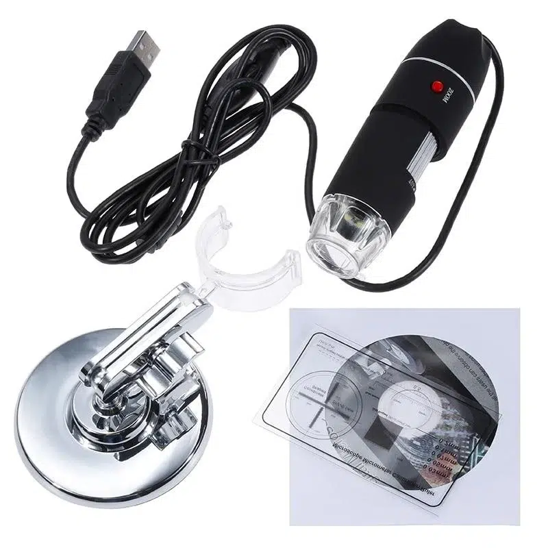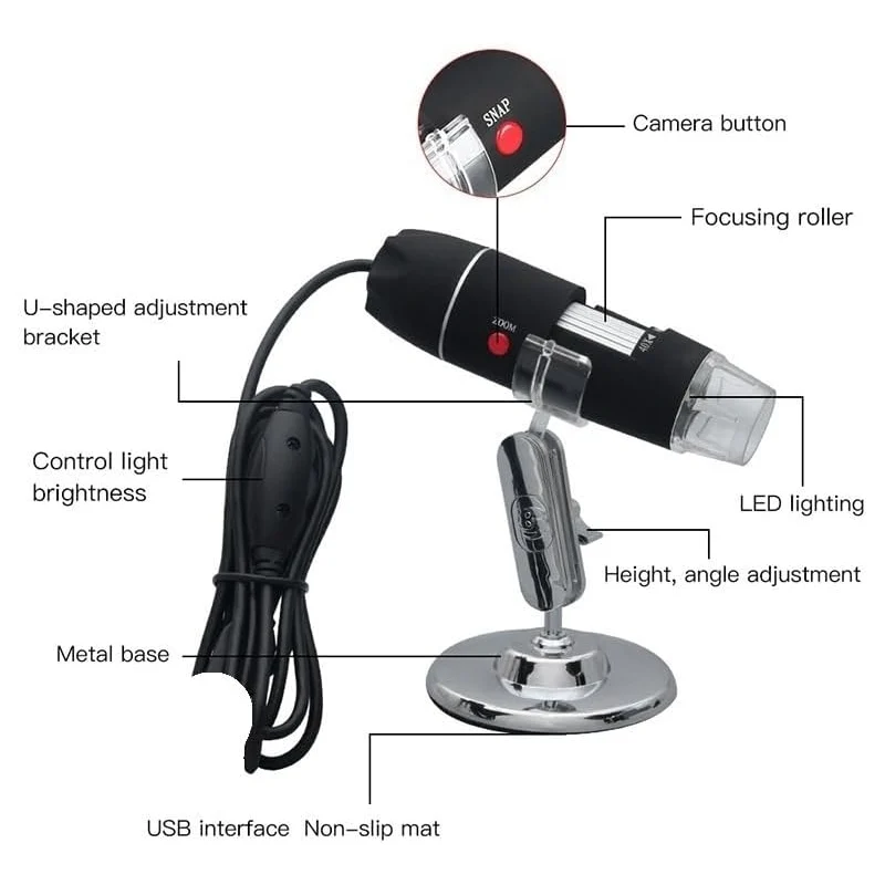 بدون نیاز به هیچ وسیله دیگر تنها با اتصال به پورت USB یک میکروسکوپ کامل در اختیار دارید، منبع نوری قوی جهت دید کامل نمونه با ۸ لامپ LED با نور قابل تنظیم تامین می شود. قابلیت فیلم برداری از نمونه های متحرک و تشریح و … و تهیه عکس و یا حتی نمایش زنده تصاویر و فیلم جهت کارهای آزمایشگاهی و آموزشی ، این وسیله اقتصادی جایگزین ارزان قیمت یک میکروسکوپ و دوربین میکروسکوپ است و کاربرد بسیار زیادی برای بخش کنترل کیفیت کارخانجات و همچنین تعمیرکارها و مونتاژکارهای قطعات ریز دارد.